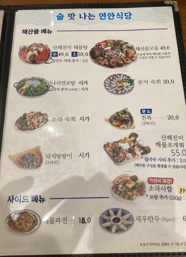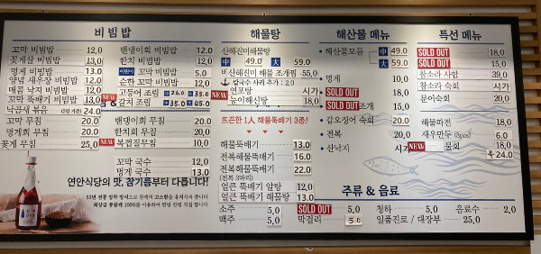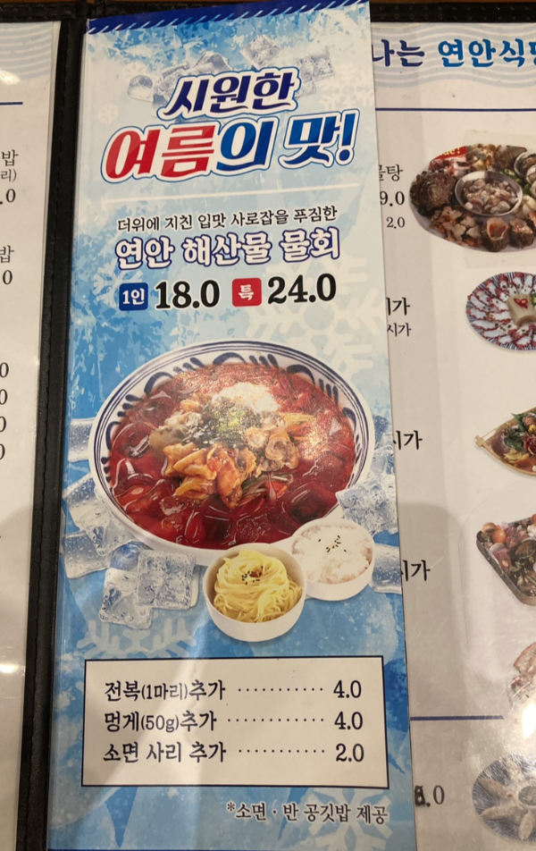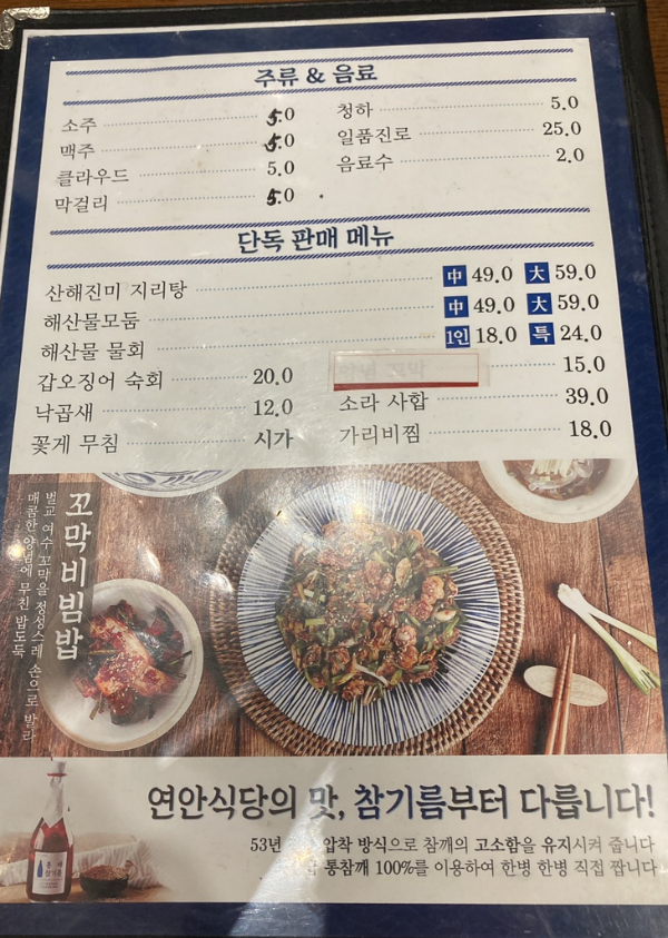 다양한 종류의 해산물 요리들이 있었는데 시원해 보이는 1인 물회와 연안식당의 시그니쳐 메뉴인 꼬막비빔밥을 선택했다.