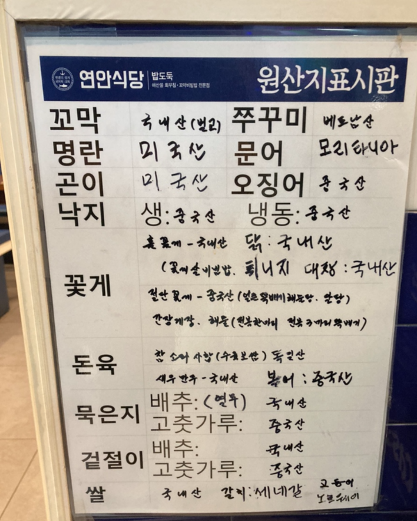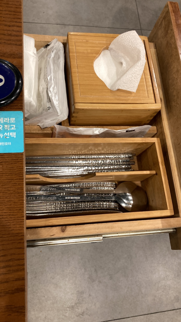 합정 메세나폴리스에 식사를 하러 갔다가 해산물 음식 전문점인 연안식당에 방문했다. 테이블 위에 물과 간장, 종이컵이 놓여 있었고 수저는 테이블 옆 서랍에 물티슈, 티슈와 함께 들어있었다.