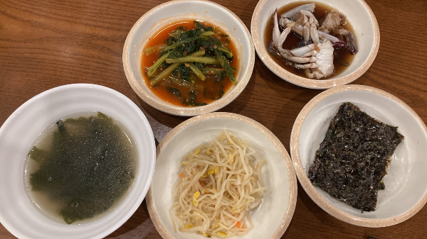 가장 먼저 나온 기본 반찬. 마시자마자 속이 풀리는 고소한 맛의 미역국과 시원한 열무김치, 짭조름한 콩나물 무침과 김, 기본 반찬으로는 호화스러운 느낌의 간장게장이 나왔다.