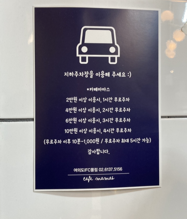 주차 : IFC몰 주차. 2만 원 이상 이용 시, 1시간 무료 이후까지 2만 원 단위로 최대 4시간까지.