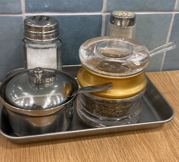 테이블 위에는 들깨와 양념장, 소금, 후추가 있었고 테이블 옆 서랍에는 수저와 냅킨이 들어 있었다.
