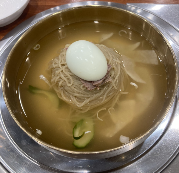 시원해 보이는 평양 물냉면. 다른 평양냉면에 비해 육수에 간이 살짝 있는 느낌이었고 고기의 향이 은은하게 났다. 면은 부드럽게 끊겨서 먹기 편했다.